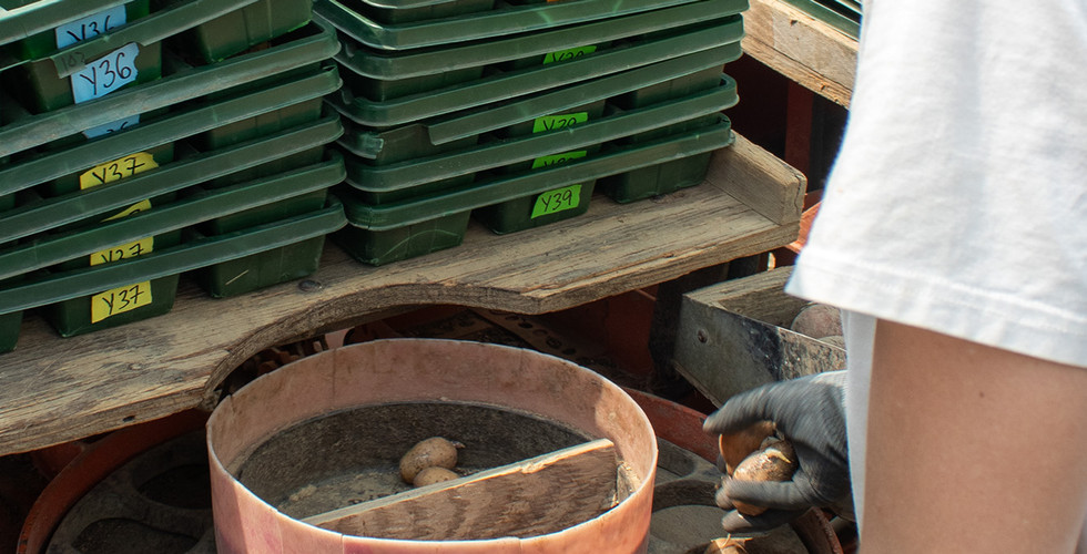Planting this quantity of tubers requires careful organization. Fifteen-cell trays are labeled with a cross ID code (e.g., Y1, Y2, Y3, Y4, etc.) and then four minitubers per clone from that cross are placed into each cell. The trays are then organized on the planter according to the planting plan previously laid out by potato breeder Walter De Jong and research support specialist Matt Falise.